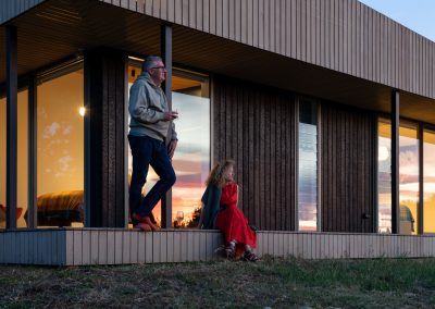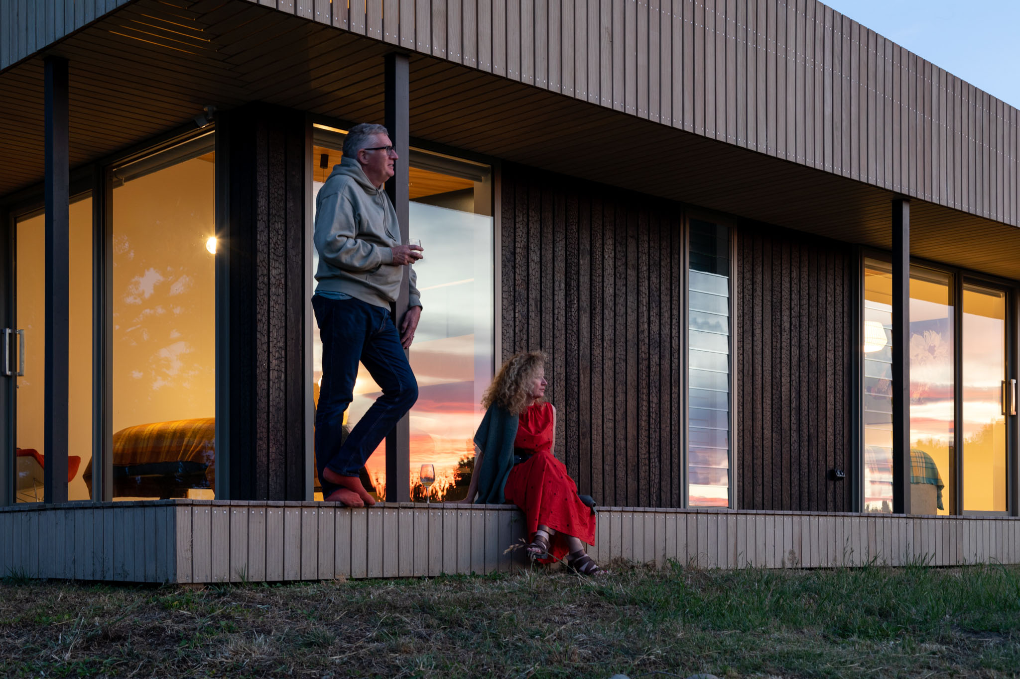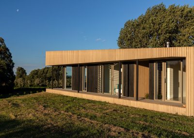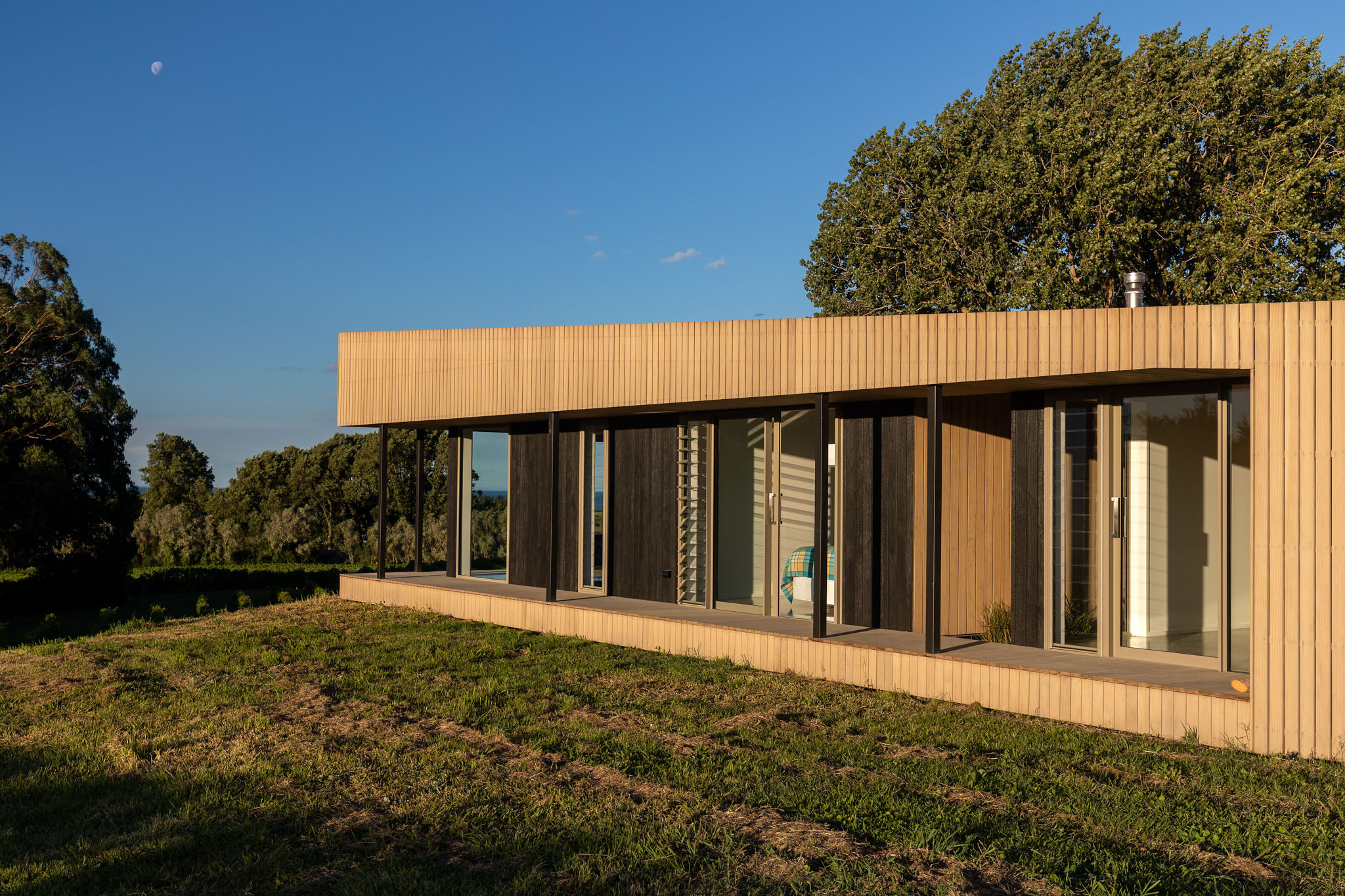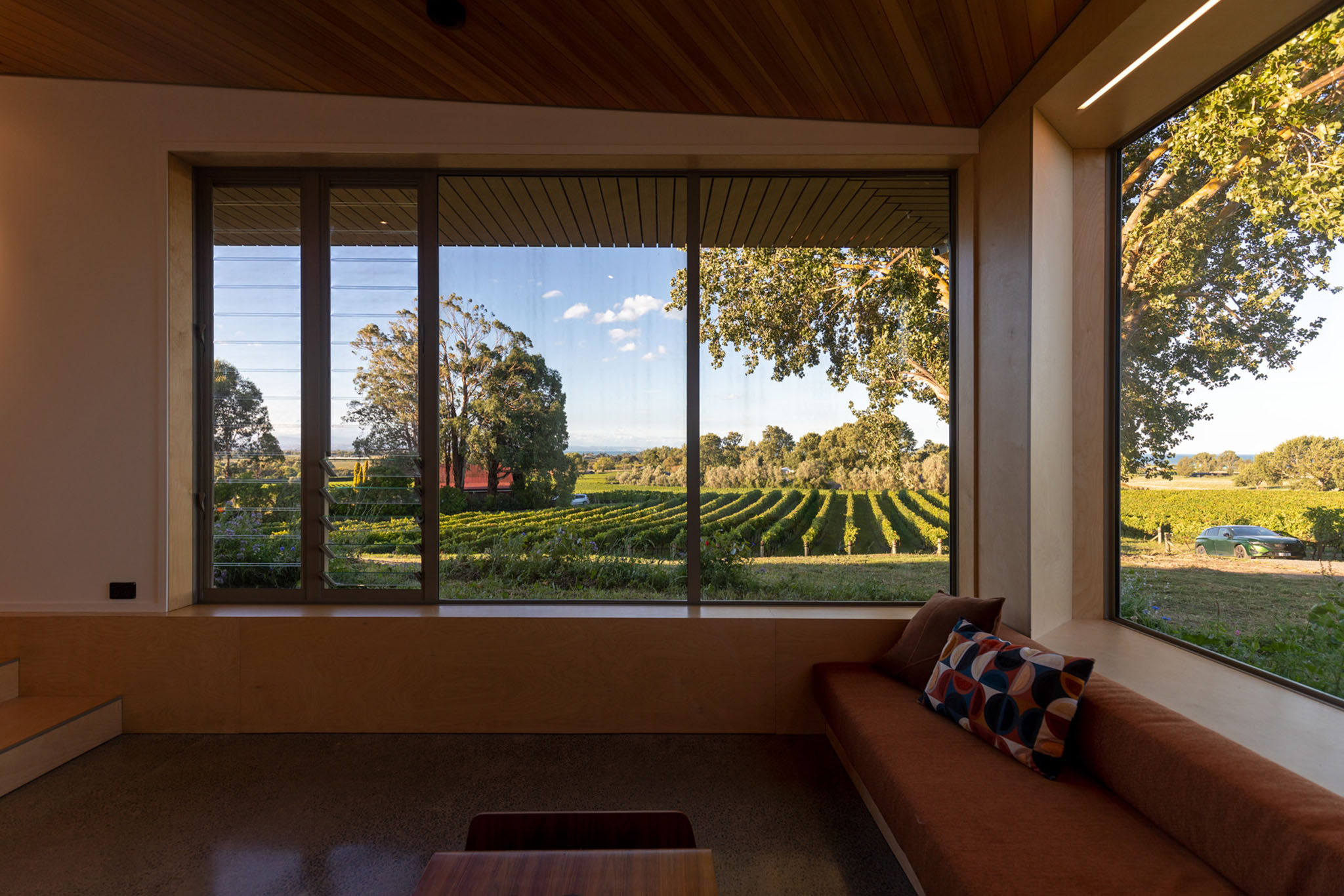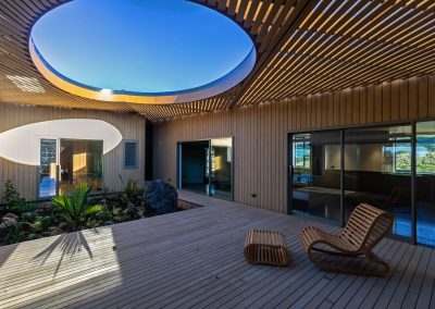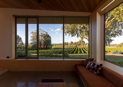 Around the house, a covered deck provides a sheltered space from the prevailing sea breezes while maintaining a connection to the surrounding vineyard and sea views. Further, the landscaping was also designed to embed the house within its landscape. It is formed by the creation of gentle contours and flat areas with Gabion basket retaining walls. All excavated ground for the construction was used within the site to create these new contours and external areas.