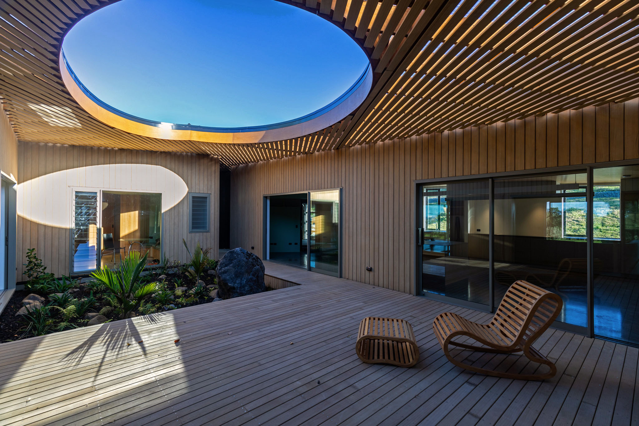 Echoing this expansive landscape, the house is designed as a large and gently folded roof over a single-storey ground plan. The program was resolved in a courtyard-typology connecting different blocks under the large canopy and inviting intimate and open spaces to dialogue around a sheltered deck and garden. Within the courtyard, an oculus partially opens the space in relation to the sun’s movement, creating dynamic shadows within its core. The independent blocks also opens to covered alleyways separating the working zone from the living zone and branching into the courtyard which creates a free-flow of circulation and framed views.